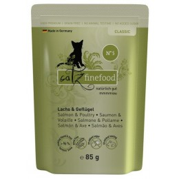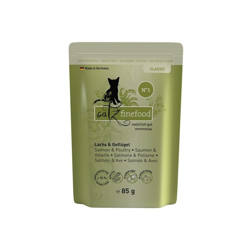 Specjał dla kotów – wartościowa karma dla naszych pupili. Catz finefood N°5 zawiera dużo delikatnej ryby, drobiu oraz zdrowe dodatki, jak szpinak i pomidory. Bez konserwantów, barwników i wzmacniaczy smaku. Nie zawiera GMO. Mmmmiau!