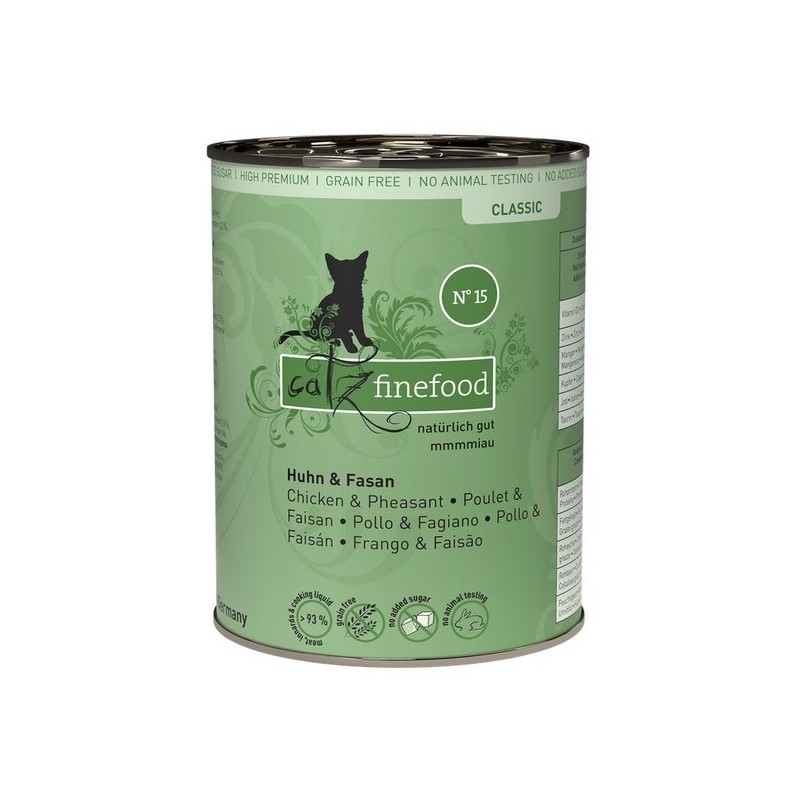 Specjał dla kotów – wartościowa karma dla naszych pupili. Catz finefood N°15 zawiera dużo delikatnego kurczaka, bażanta oraz wartościowe dodatki, jak rzeżucha i mniszek lekarski. Bez konserwantów, barwników i wzmacniaczy smaku. Nie zawiera GMO. Mmmmiau!