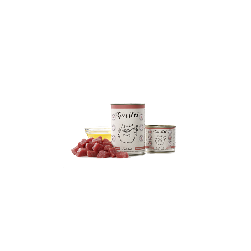 Pełnowartościowa, kompletna i znakomicie zbilansowana karma superpremium dla kotów. Produkowana jest w 100% z najwyższej jakości świeżego mięsa w wysokim standardzie odpowiadającym wymaganiom żywności dla ludzi. Gussto to esencja dobrego i zdrowego żywienia. Zawiera bardzo dużo mięsa idealnie odpowiadając specyficznym wymaganiom pokarmowym kotów. Jest to karma monobiałkowa, a więc holistyczna, lekkostrawna i bardzo dobrze przyswajalna polecana również kotom o wrażliwym przewodzie pokarmowym. Stosowana także w dietach wykluczających przy alergiach pokarmowych. Znakomicie zrównoważony stosunek wapń/fosfor minimalizuje ryzyko chorób układu moczowego i nerek. Dodatkowo karma Gussto zawiera dużo niezbędnych witamin i minerałów jest bardzo bogata w Taurynę i Biotynę, a w jej skład wchodzi dobroczynny olej z ostropestu – bogaty w nienasycone kwasy tłuszczowe, który ma działanie przeciwzapalne, reguluje czynności trawienne i regeneracyjne wątroby, oraz wzmacnia system odpornościowy.