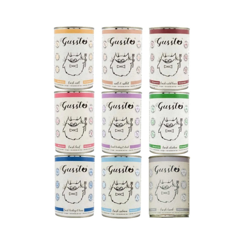 Zestaw karmy Gussto mix 4 x 400/375G. Pełnowartościowa, kompletna i znakomicie zbilansowana karma superpremium dla kotów. Produkowana jest w 100% z najwyższej jakości świeżego mięsa w wysokim standardzie odpowiadającym wymaganiom żywności dla ludzi. Gussto to esencja dobrego i zdrowego żywienia.