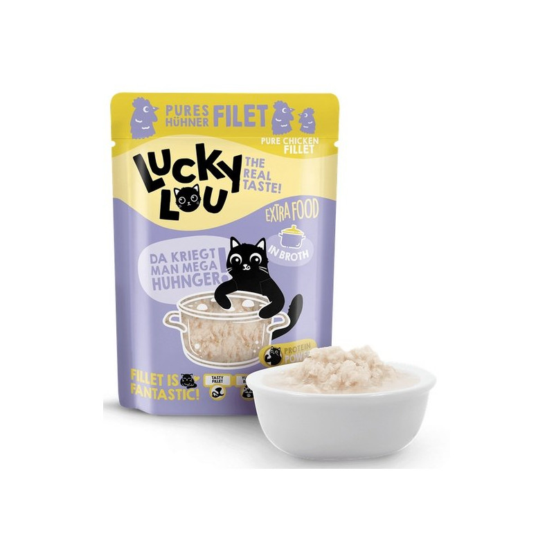 Koty, lubią być rozpieszczane. Też lubisz od czasu do czasu prawdziwą ucztę, prawda? Dokładnie tak samo jest z kotami. Kochają dodatki! I dlatego do linii karm mokrych dodaliśmy Lucky Lou Extra Food. To soczysty filet przygotowany w galarecie lub w bulionie. To jest ekstra pyszne!
