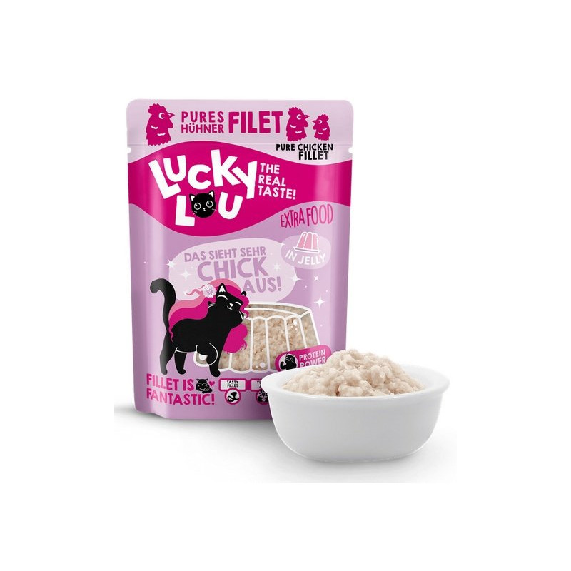 Koty, lubią być rozpieszczane. Też lubisz od czasu do czasu prawdziwą ucztę, prawda? Dokładnie tak samo jest z kotami. Kochają dodatki! I dlatego do linii karm mokrych dodaliśmy Lucky Lou Extra Food. To soczysty filet przygotowany w galarecie lub w bulionie. To jest ekstra pyszne!