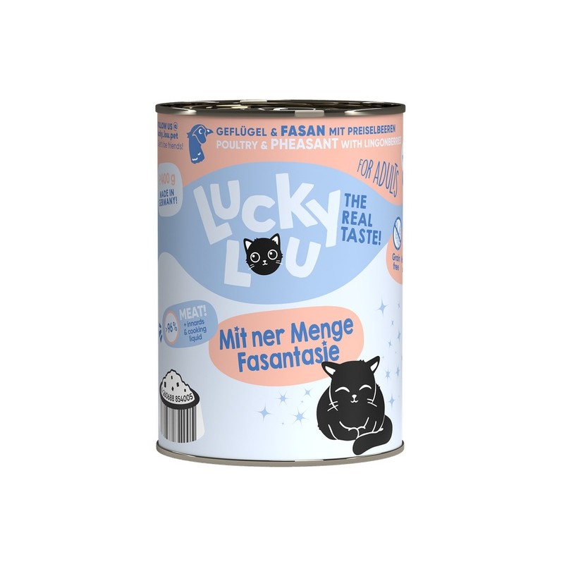 Gdzie indziej jest nudne standardowe jedzenie - Lucky Lou jest dostępne w 18 różnych odmianach smakowych w saszetkach 125 g oraz w puszkach 200 g i 400 g. Karma produkowana w Niemczech.