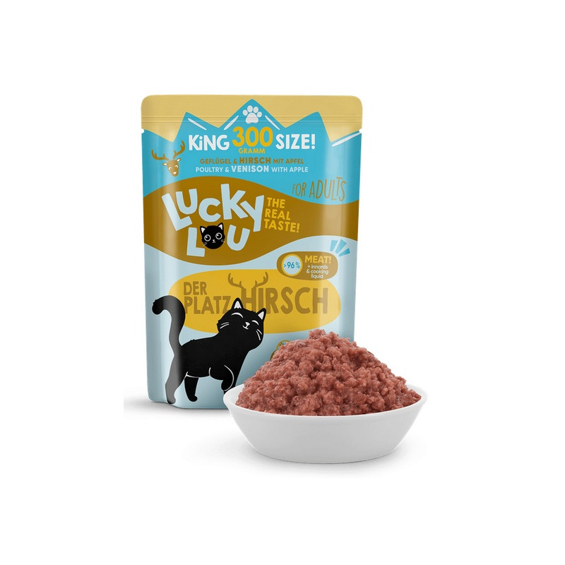 Gdzie indziej jest nudne standardowe jedzenie - Lucky Lou jest dostępne w 18 różnych odmianach smakowych w saszetkach 125 g oraz w puszkach 200 g i 400 g. Karma produkowana w Niemczech.