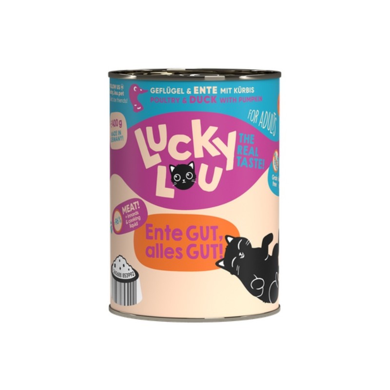 Gdzie indziej jest nudne standardowe jedzenie - Lucky Lou jest dostępne w 18 różnych odmianach smakowych w saszetkach 125 g oraz w puszkach 200 g i 400 g. Karma produkowana w Niemczech.