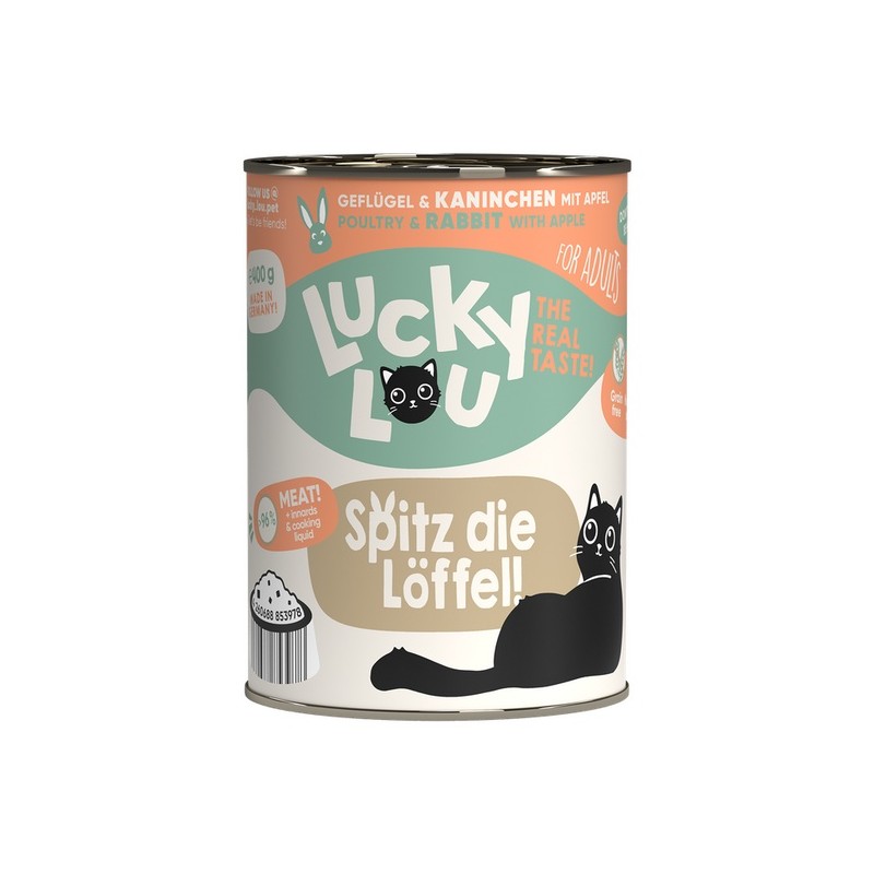 Gdzie indziej jest nudne standardowe jedzenie - Lucky Lou jest dostępne w 18 różnych odmianach smakowych w saszetkach 125 g oraz w puszkach 200 g i 400 g. Karma produkowana w Niemczech.