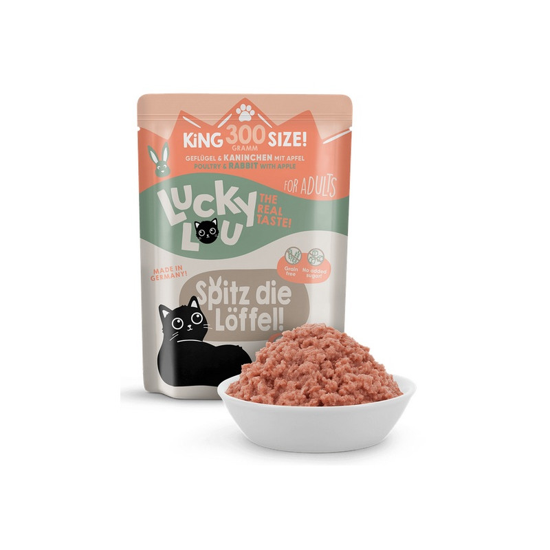 Gdzie indziej jest nudne standardowe jedzenie - Lucky Lou jest dostępne w 18 różnych odmianach smakowych w saszetkach 125 g oraz w puszkach 200 g i 400 g. Karma produkowana w Niemczech.