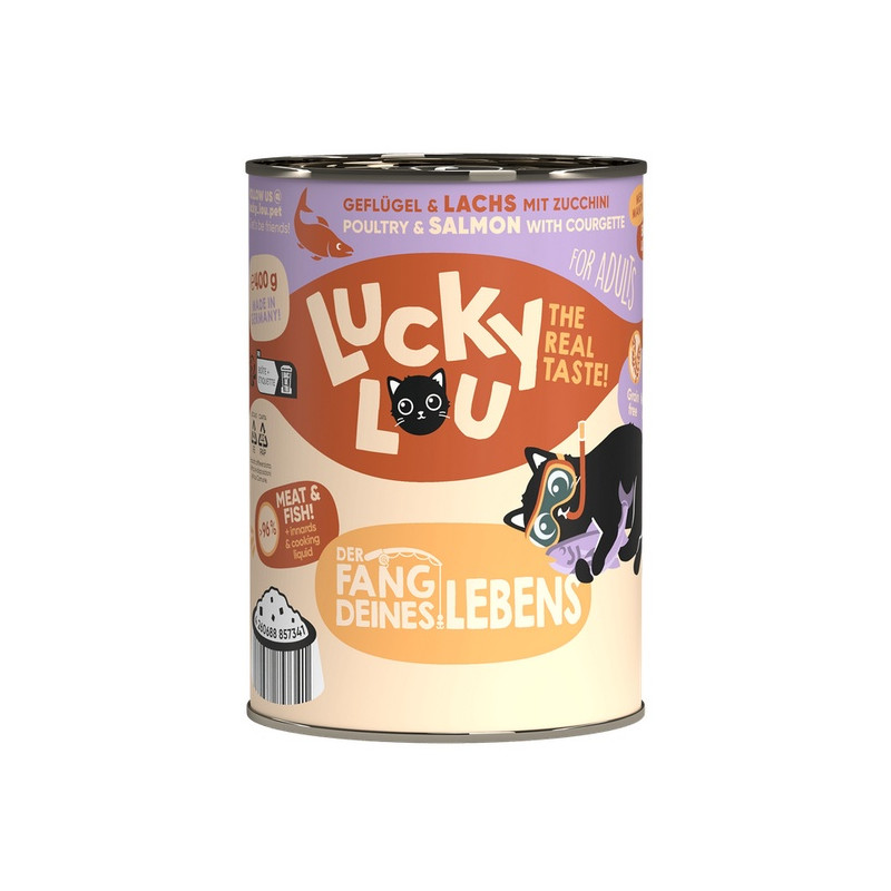 Gdzie indziej jest nudne standardowe jedzenie - Lucky Lou jest dostępne w 18 różnych odmianach smakowych w saszetkach 125 g oraz w puszkach 200 g i 400 g. Karma produkowana w Niemczech.