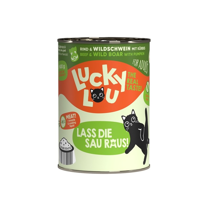Gdzie indziej jest nudne standardowe jedzenie - Lucky Lou jest dostępne w 18 różnych odmianach smakowych w saszetkach 125 g oraz w puszkach 200 g i 400 g. Karma produkowana w Niemczech.