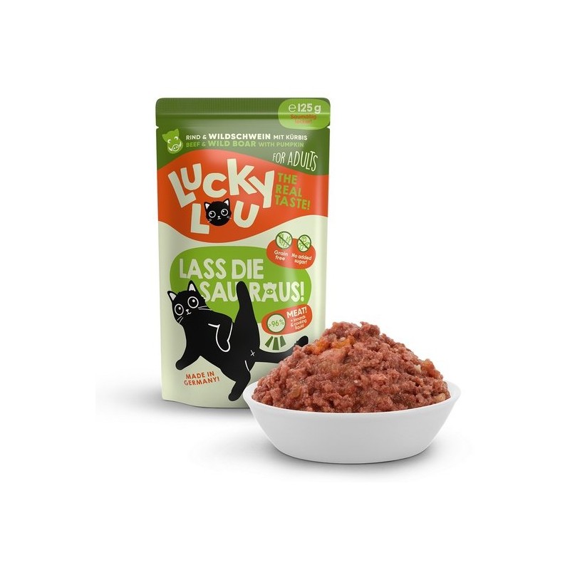 Gdzie indziej jest nudne standardowe jedzenie - Lucky Lou jest dostępne w 18 różnych odmianach smakowych w saszetkach 125 g oraz w puszkach 200 g i 400 g. Karma produkowana w Niemczech.