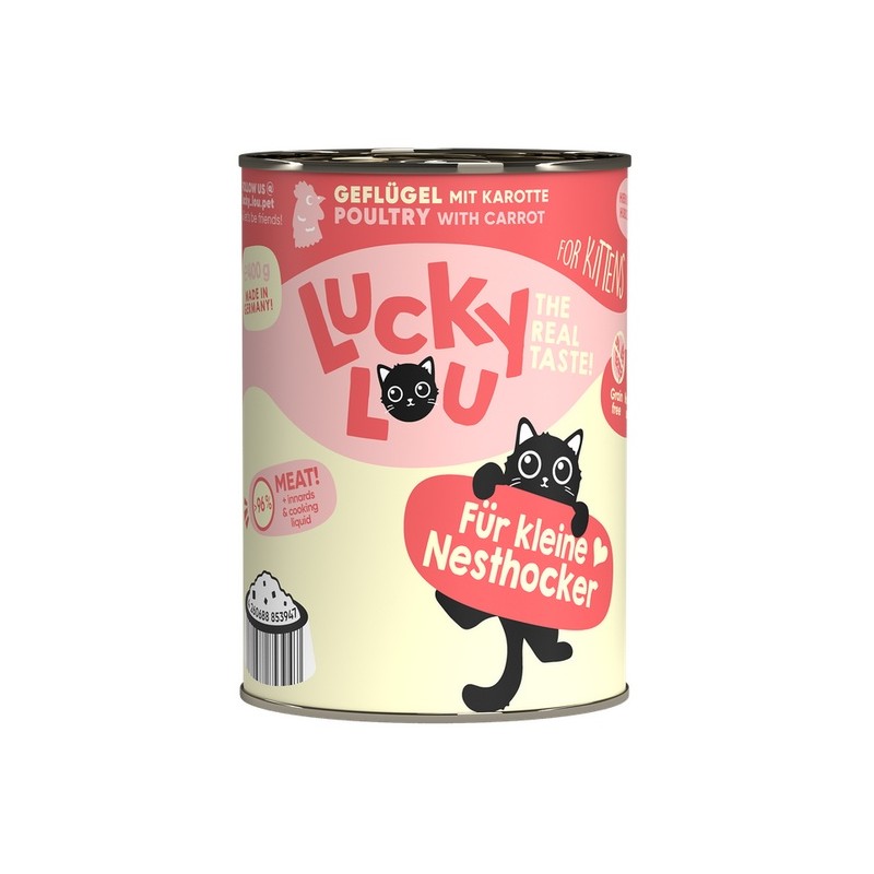 Gdzie indziej jest nudne standardowe jedzenie - Lucky Lou jest dostępne w 18 różnych odmianach smakowych w saszetkach 125 g oraz w puszkach 200 g i 400 g. Karma produkowana w Niemczech.