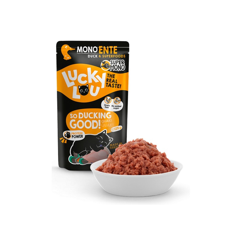 Lucky Lou Supermono jest karmą pełnoporcjową dla kotów. Nie zawiera zbóż ani cukru. Mokre, wysokiej jakości jednobiałkowe jedzenie, które przypadnie do gustu kocim smakoszom, również wrażliwym.
