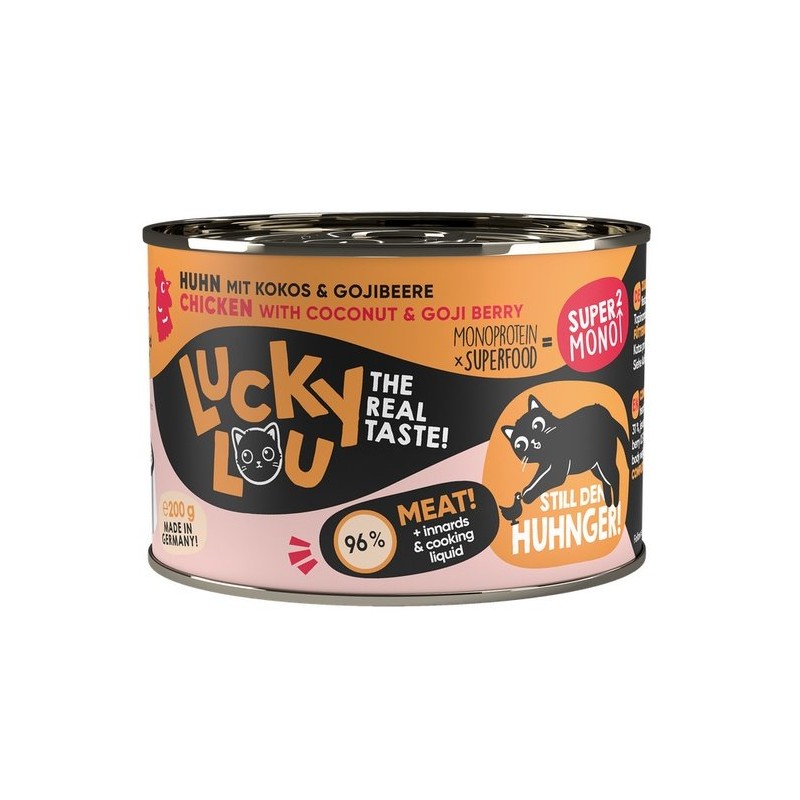 Lucky Lou Supermono jest karmą pełnoporcjową dla kotów. Nie zawiera zbóż ani cukru. Mokre, wysokiej jakości jednobiałkowe jedzenie, które przypadnie do gustu kocim smakoszom, również wrażliwym.