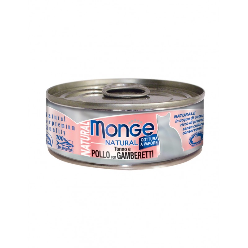 Uzupełniająca karma dla dorosłych kotów z kawałkami pysznego tuńczyka, kurczaka i krewetek w sosie własnym.