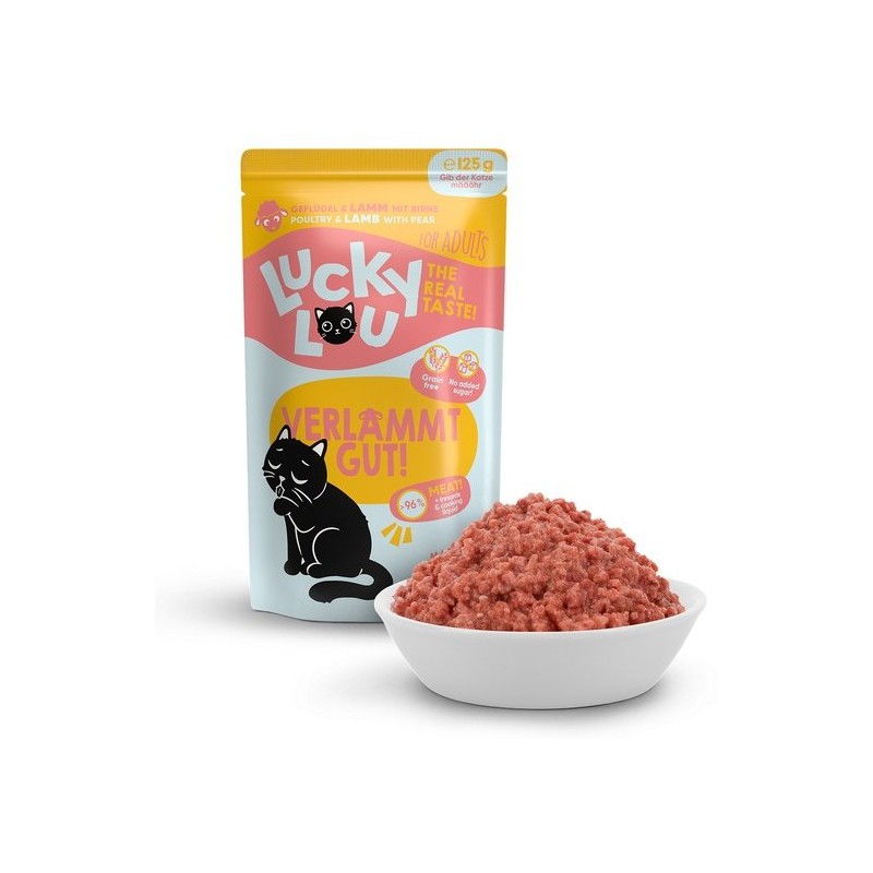Gdzie indziej jest nudne standardowe jedzenie - Lucky Lou jest dostępne w 18 różnych odmianach smakowych w saszetkach 125 g oraz w puszkach 200 g i 400 g. Karma produkowana w Niemczech.