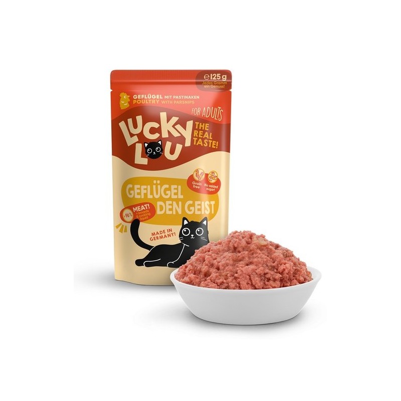 Gdzie indziej jest nudne standardowe jedzenie - Lucky Lou jest dostępne w 18 różnych odmianach smakowych w saszetkach 125 g oraz w puszkach 200 g i 400 g. Karma produkowana w Niemczech.