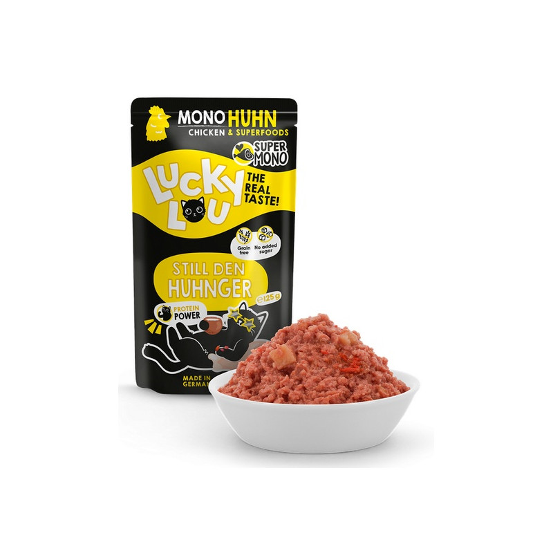 Lucky Lou Supermono jest karmą pełnoporcjową dla kotów. Nie zawiera zbóż ani cukru. Mokre, wysokiej jakości jednobiałkowe jedzenie, które przypadnie do gustu kocim smakoszom, również wrażliwym.