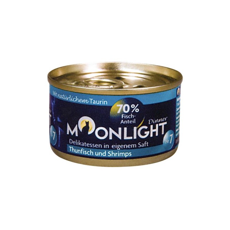 Moonlight Dinner to zdrowe, aromatyczne, prawdziwe mięsne kawałki, za którymi przepadają koty. W 100% naturalne, pyszne danie: soczyste kawałki tuńczyka i całe krewetki.