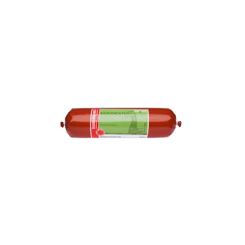 Skład: 80 % mięso kaczki i podroby (40% mięso kaczki, 20% serce kaczki, 20% wątroba kaczki, 20% szyje kaczki), 15 % szarłat, 5 % jabłka, sproszkowane skorupki jaj