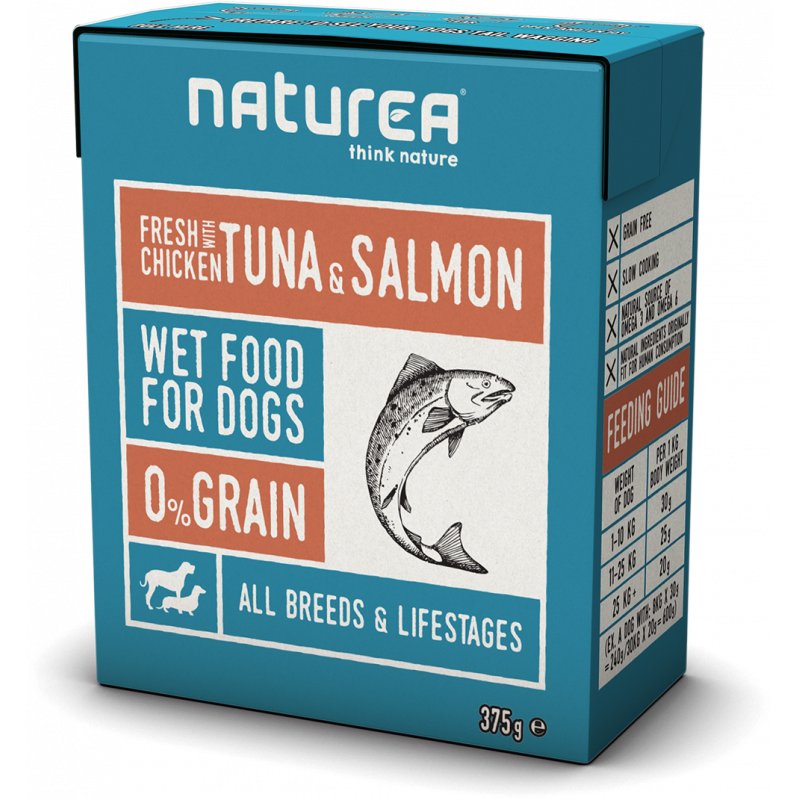 Naturea Chicken with tuna and salmon to prawdziwa bezzbożowa mokra karma dla psów wszystkich ras w celu zaspokojenia ich potrzeb żywieniowych w każdym okresie ich życia. Dieta ta oparta jest na naturalnie odpowiednich, biologicznych potrzebach mięsożerców, ponieważ posiada mało węglowodanów i zawiera aż 88% świeżej ryby i świeżego mięsa. Naturea Chicken with tuna and salmon jest pełnowartościowa, idealnie zbilansowana i zawiera zestaw niezbędnych witamin i minerałów oraz nienasyconych kwasów tłuszczowych Omega-3 i Omega-6, które dbają o zdrowie, kondycję i lśniącą sierść.