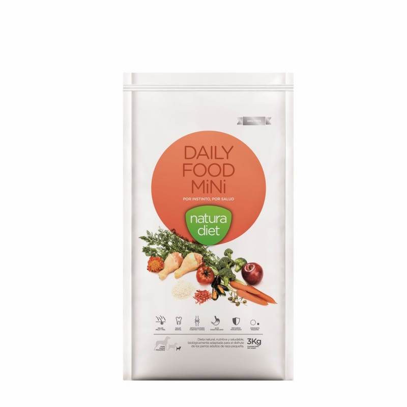 NATURA DIET DAILY FOOD MINI – karma sucha. Naturalna i zbilansowana karma dla dorosłych psów ras małych i miniaturowych o normalnej aktywności. Rozmiar krokieta został zmniejszony i dopasowany do pupila tak, aby ułatwić mu jego spożycie.