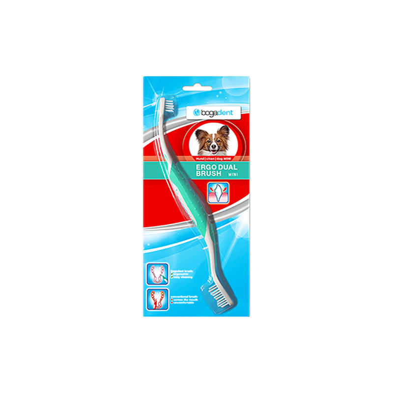 Płytka nazębna i kamień nazębny gromadzą się szczególnie wokół zębów trzonowych i mogą powodować trwałe uszkodzenie dziąseł i podtrzymującej tkanki łącznej. Płytkę nazębną należy zatem usuwać zawczasu i regularnie. W tym celu, we współpracy z weterynarzami, opracowaliśmy zupełnie nowy rodzaj szczoteczki do zębów, bogadent® ERGO DUAL BRUSH. Jej specyficzny ergonomiczny i funkcjonalny kształt pozwala na łatwe czyszczenie zębów. Szczoteczka została specjalnie zaprojektowana by dotrzeć nawet do wewnętrznej części zębów trzonowych.