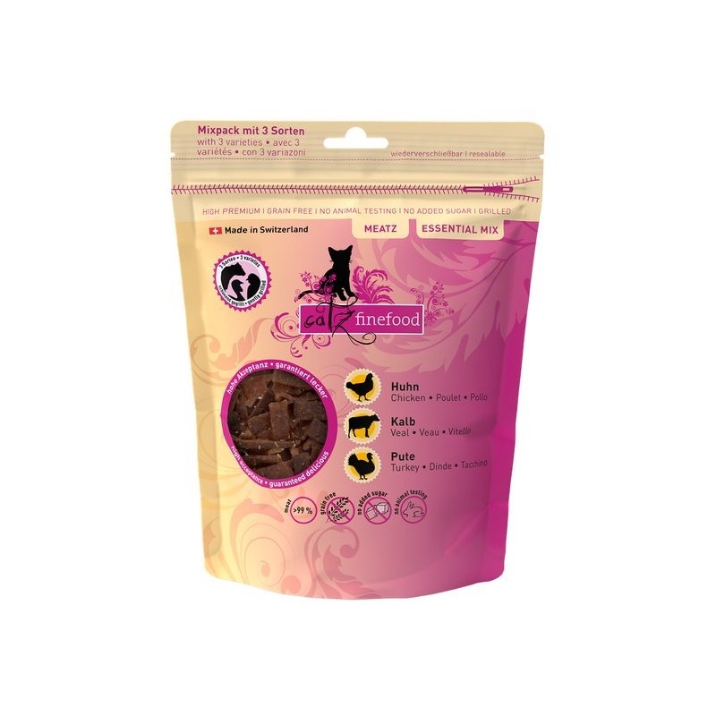 (Każdy wydany 10,00 zł = 1 punkt)Catz Finefood Meatz Essential Mix to chrupiące paski z 100% grillowanego i suszonego mięsa z trzech gatunków: kurczaka, indyka i cielęciny.