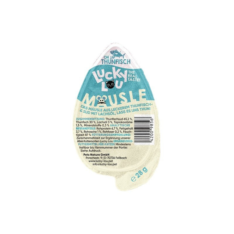Realizując naszą misję stworzenia najlepszej na świecie karmy dla kotów, stworzyliśmy kolejny rozkoszny przysmak: przekąskę w kształcie myszy. Świetnie, prawda? Najlepszy pasztet o naprawdę najlepszym smaku Lucky Lou. Ze względu na kuszący kształt myszy, koty nie mogą powstrzymać się od podchodzenia do niej, aby ją zbadać i skubać. Mäusle są po prostu pyszne!