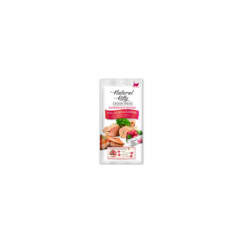 Skład: tuńczyk, płatki ziemniaczane, wzmacniacz smaku, ekstrakt z tuńczyka, łosoś, żurawina, guma polisacharydowa, tauryna, witamina E, oligosacharydy, pięciowodny mleczan wapnia, woda.